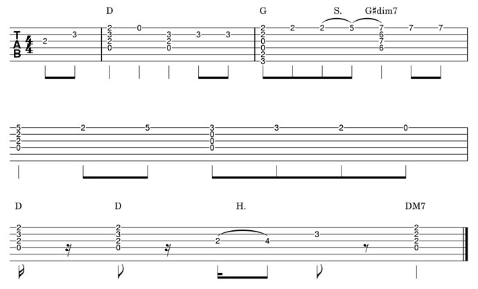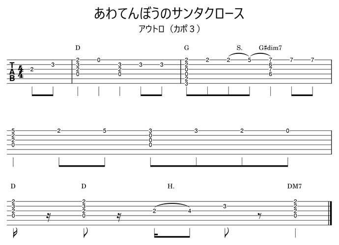 ソロギターで弾く場合は下のタブ譜を参考に。