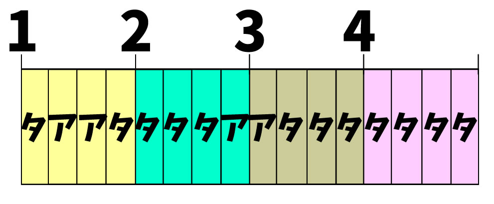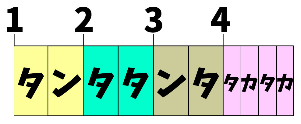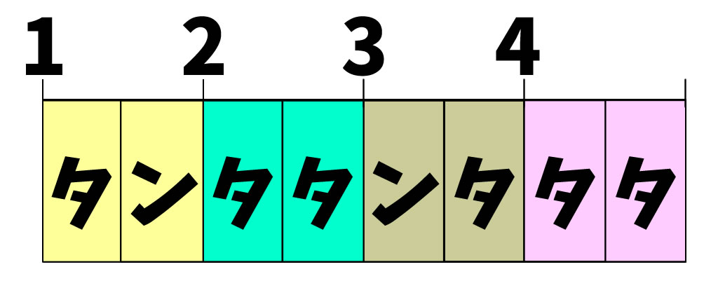 残りの3つは8分音符だから3部屋使ってタタタですね。