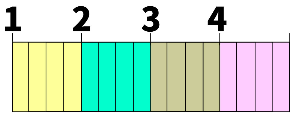 それに対して16ビートは4分音符が4部屋分、8分音符が2部屋、16分音符が1部屋になります。